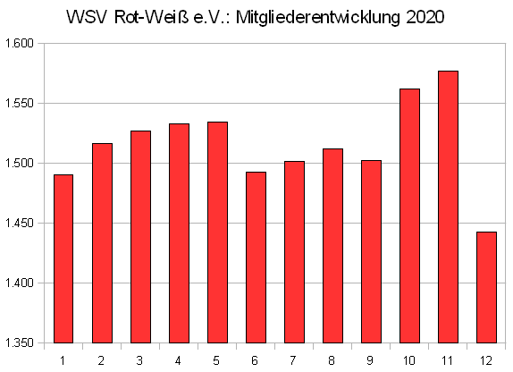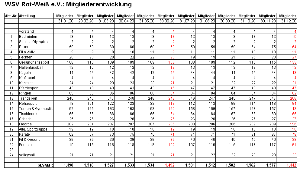 Die Corona-Pandemie hinterlässt zum Jahresende ihre Spuren und lässt die Mitgliederzahlen des Wernigeröder Sportverein „Rot-Weiß“ e.V. sinken. Während im Oktober und November 2020 noch Neuaufnahmen verzeichnet wurden und der WSV Rot-Weiß zum Ende des Monats November auf 1.577 Mitglieder verweisen konnte, brach die Mitgliederzahl zum Jahresende um 135 Mitglieder ein. Aktuelle Mitgliederzahl: 1.442 (Stand: 31.12.2020).