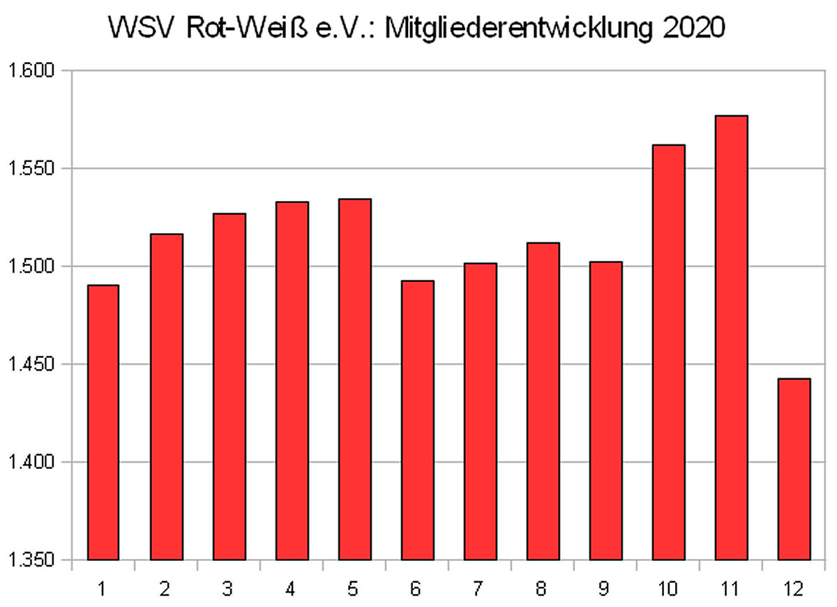 Die Corona-Pandemie hinterlässt zum Jahresende ihre Spuren und lässt die Mitgliederzahlen des Wernigeröder Sportverein „Rot-Weiß“ e.V. sinken. Während im Oktober und November 2020 noch Neuaufnahmen verzeichnet wurden und der WSV Rot-Weiß zum Ende des Monats November auf 1.577 Mitglieder verweisen konnte, brach die Mitgliederzahl zum Jahresende um 135 Mitglieder ein. Aktuelle Mitgliederzahl: 1.442 (Stand: 31.12.2020).