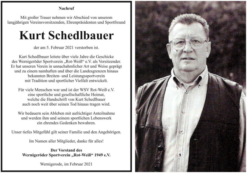 Der Wernigeröder Sportverein „Rot-Weiß“ 1949 e.V. trauert um seinen langjährigen Vereinsvorsitzenden, Ehrenpräsidenten und Sportfreund Kurt Schedlbauer, der am 5. Februar 2021 verstorben ist.