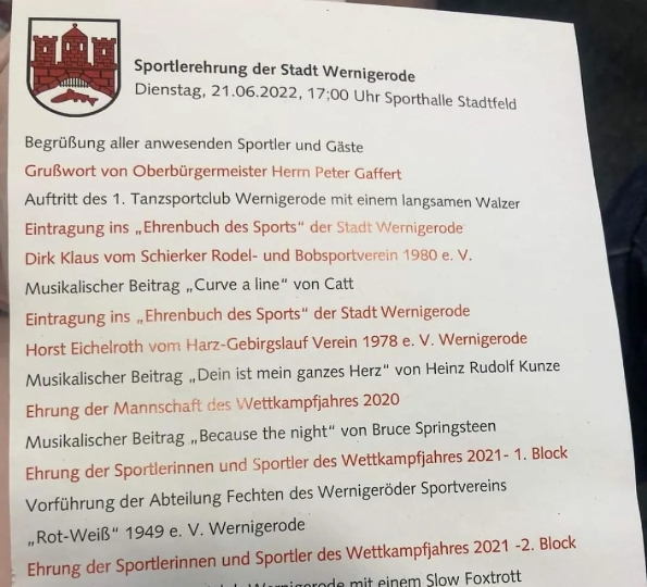Wir bedanken uns nochmal recht herzlich bei der Stadt Wernigerode für eine kurzweilige und schöne Ehrungsveranstaltung.