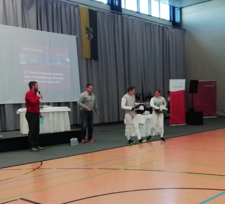 Vor knapp 100 Sportlerinnen und Sportlern sowie geladenen Gästen aus Sport, Politik und Wirtschaft demonstrierten die 11-jährige Emma und der 15-jährige Emil gemeinsam mit ihrem Trainer Lars Seidel in einer unterhaltsamen Darbietung die Kunst des Fechtsports.