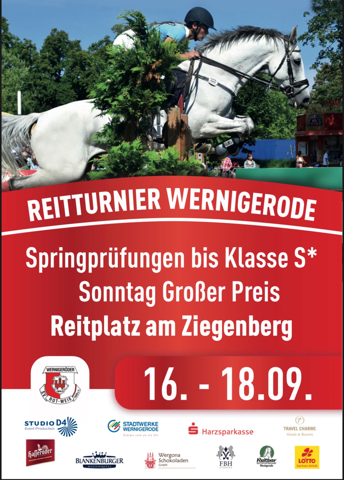 Vom 16. bis 18. September 2022 findet das traditionelle Reitturnier des Wernigeröder Sportverein „Rot-Weiß“ auf dem Reitplatz „Am Ziegenberg“ statt. Die Veranstaltung gehört zu einer der größten seiner Art in Sachsen-Anhalt und zieht von Jahr zu Jahr immer mehr Teilnehmer und Besucher in seinen Bann. „In diesem Jahr haben wir von Freitag bis Sonntag knapp 400 Starts. Das absolute Highlight steht dann am Sonntag mit dem „Großen Preis“ auf dem Programm, der von der Stadt Wernigerode unterstützt wird“, so Abteilungsleiter und Organisationschef Heinz Jürgen Preller.